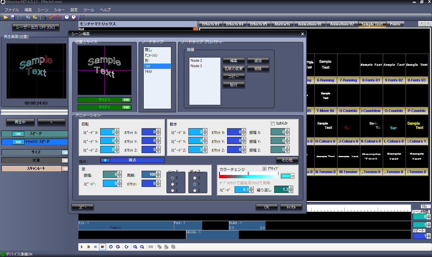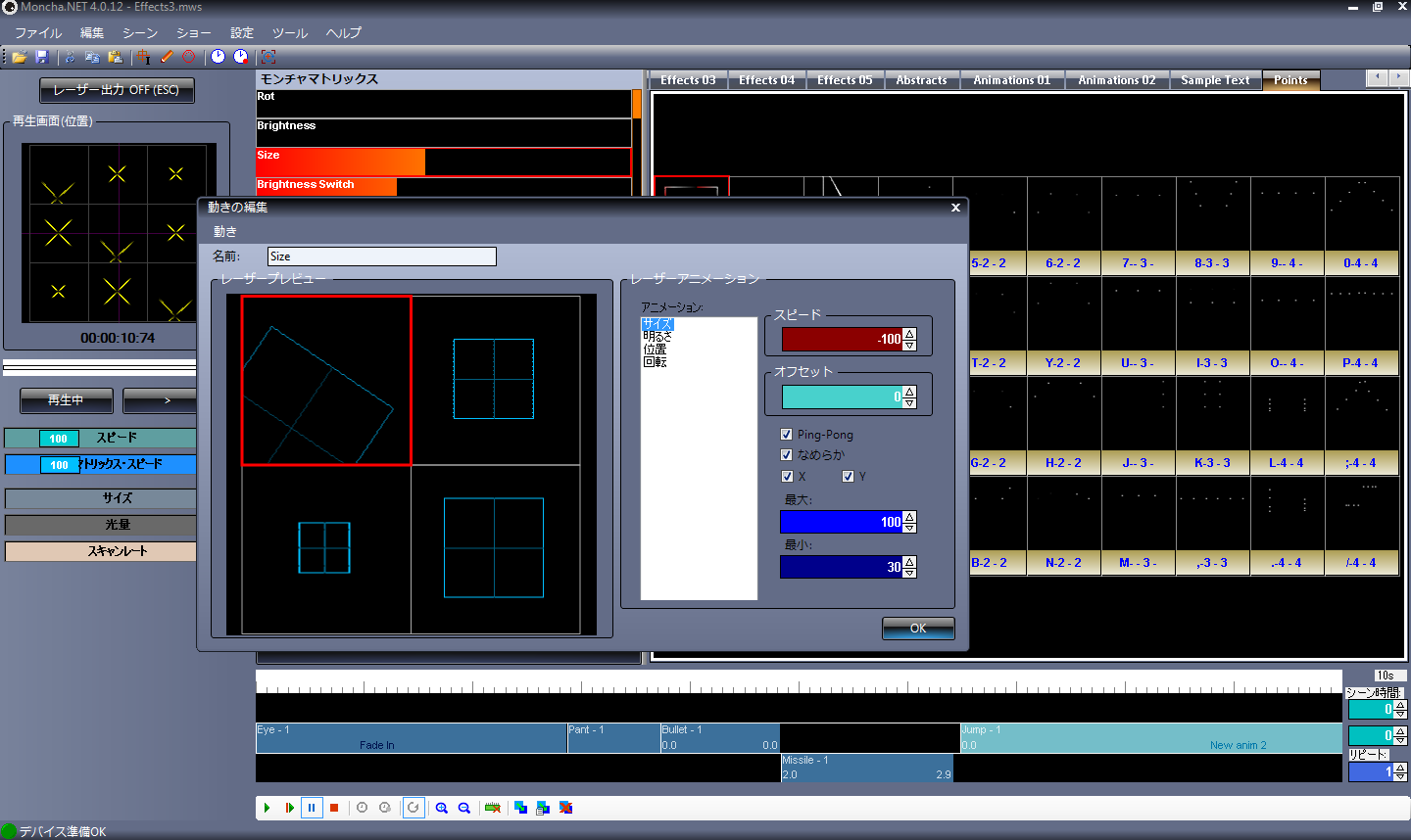 ・何台ものレーザーを簡単にコントロール出来ます。 Moncha.NETを使えば簡単に出来ます。 Moncha.NETにはLaserMatrix機能が標準で備わっています。 これは9台をコントロールしている画面です。 既存のマクロで色々な動きを簡単にコントロールでき、好きな動きのマクロを作ることも出来ます。更に、マクロを組み合わせたマクロを登録することも簡単に出来ます。 |