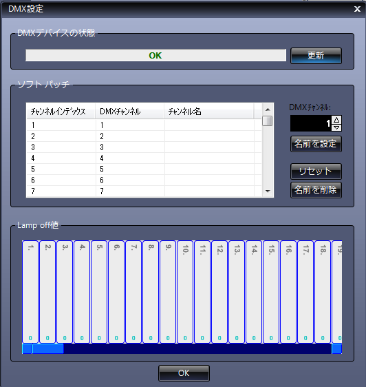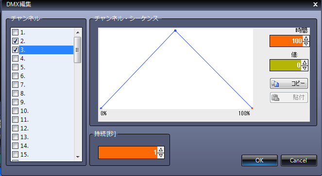 | この様に見た目で解りやすく縦軸にフェーダーの量、横軸に時間となります。 DMXの設定はシーンに入れ込むことが出来ますのでシーンを選択するとDMXが設定されていれば同時に動きます。 シーンに入っていますのでショーを作る時に入れ込むことも可能です。 |